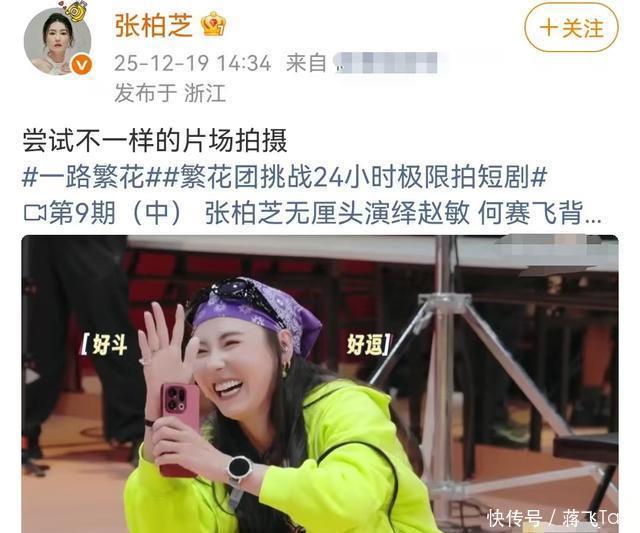三、相关近况 12月19日,张柏芝在个人社交账号上发了一条跟《一路繁花》节目有关的动态。 在动态下方视频里露面的她,戴着紫色系的头巾,穿着荧光色的外套,与其他嘉宾有说有笑。