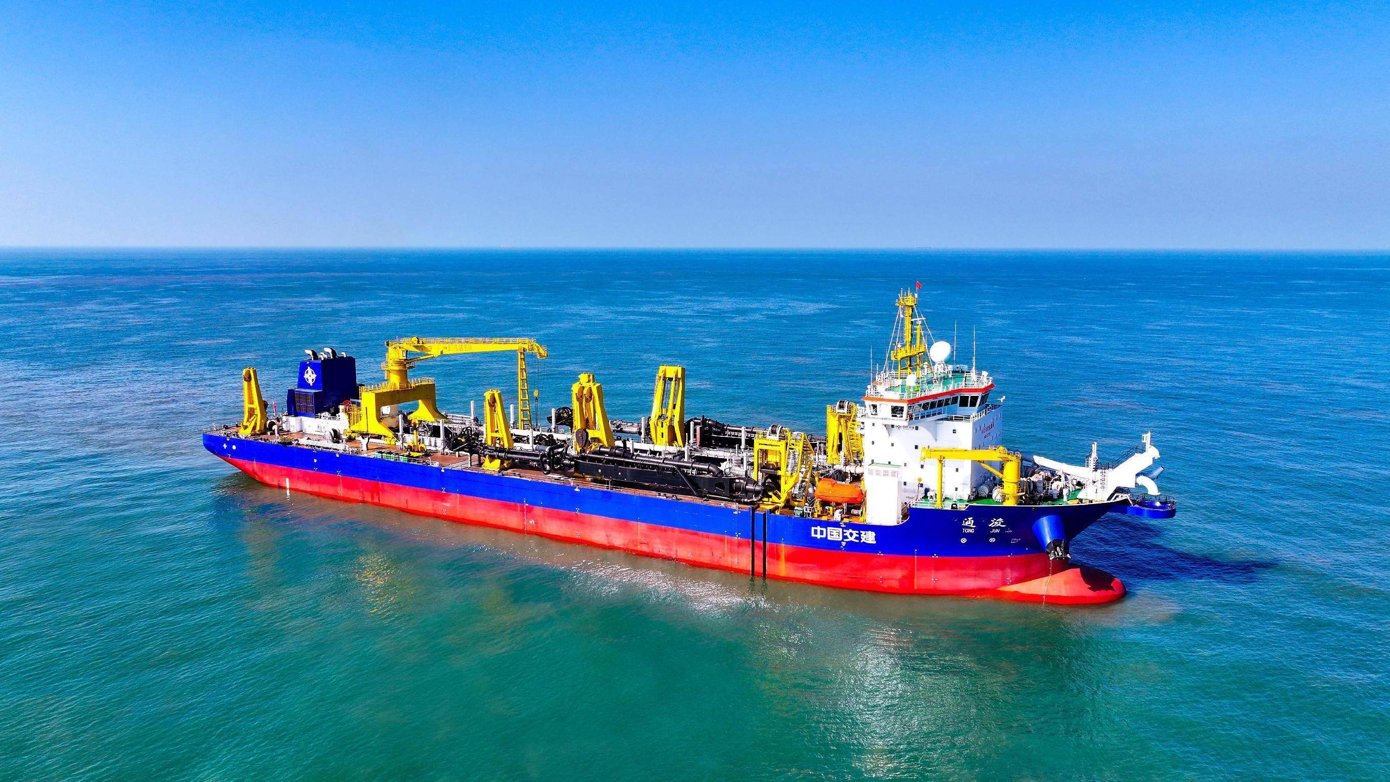 作为我国首艘自主设计建造的35000立方米舱容等级超大型耙吸挖泥船,其总长918米,型宽38.5米,总吨36903,载重吨39575。“通浚”轮的入籍是“中国洋浦港”航运能级与服务国家战略能力的质的飞跃。其正式加盟大幅提升了“中国洋浦港”在航道疏浚、岸线修复等领域的综合服务能力,推动其船型全面覆盖原油运输、重大件运输、工程作业等多个关键领域,形成更具竞争力的航运服务体系。