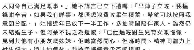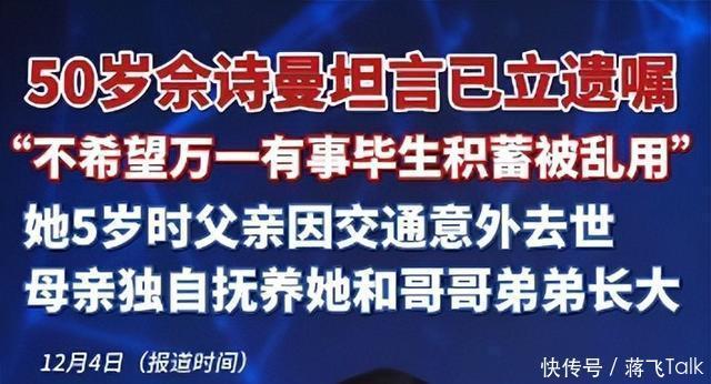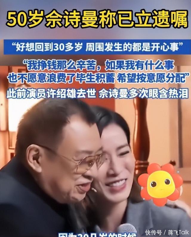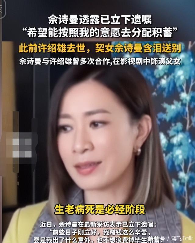 在阅读此文之前,辛苦您点击一下“关注”,既方便您进行讨论和分享,又能给您带来不一样的参与感,感谢您的支持! 文丨 呦呦鹿鸣 编辑丨 爱吃叉骨 最近50岁的余诗曼在采访里表示自己早就立好了遗嘱,她的《新闻女王2》正在热播,所以她采访也引起了很多人的关注。 在12月4号报道了她接受采访的视频,采访里她自曝早就已经立好了遗嘱,她做这个决定可能和干爹许绍雄有点关系,