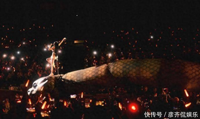 而争议,正是从这些舞美设计开始的。演出中出现了大量巨型艺术装置与奇异生物道具:开场是三层楼高的金色公牛;舞台中央有蜿蜒而行的巨蟒;章节演出中反复出现蛇形结构、异形生物、巨大书本等强烈符号。在第一章“花园中的女孩出走”里,巨型“庆典公牛”绕场巡行,蔡依林身着前卫透肤造型登场;第二章“愉悦在苦痛中回荡”,她换上黑色铆钉服装,背负巨型黑色翅膀演唱;第三章“愚者的奉献”,名为“真相之书”的巨型书本装置缓缓打开,她从中走出;直到第五章“她创造的花园”,蛇形设计元素再次出现,视觉冲击极强。